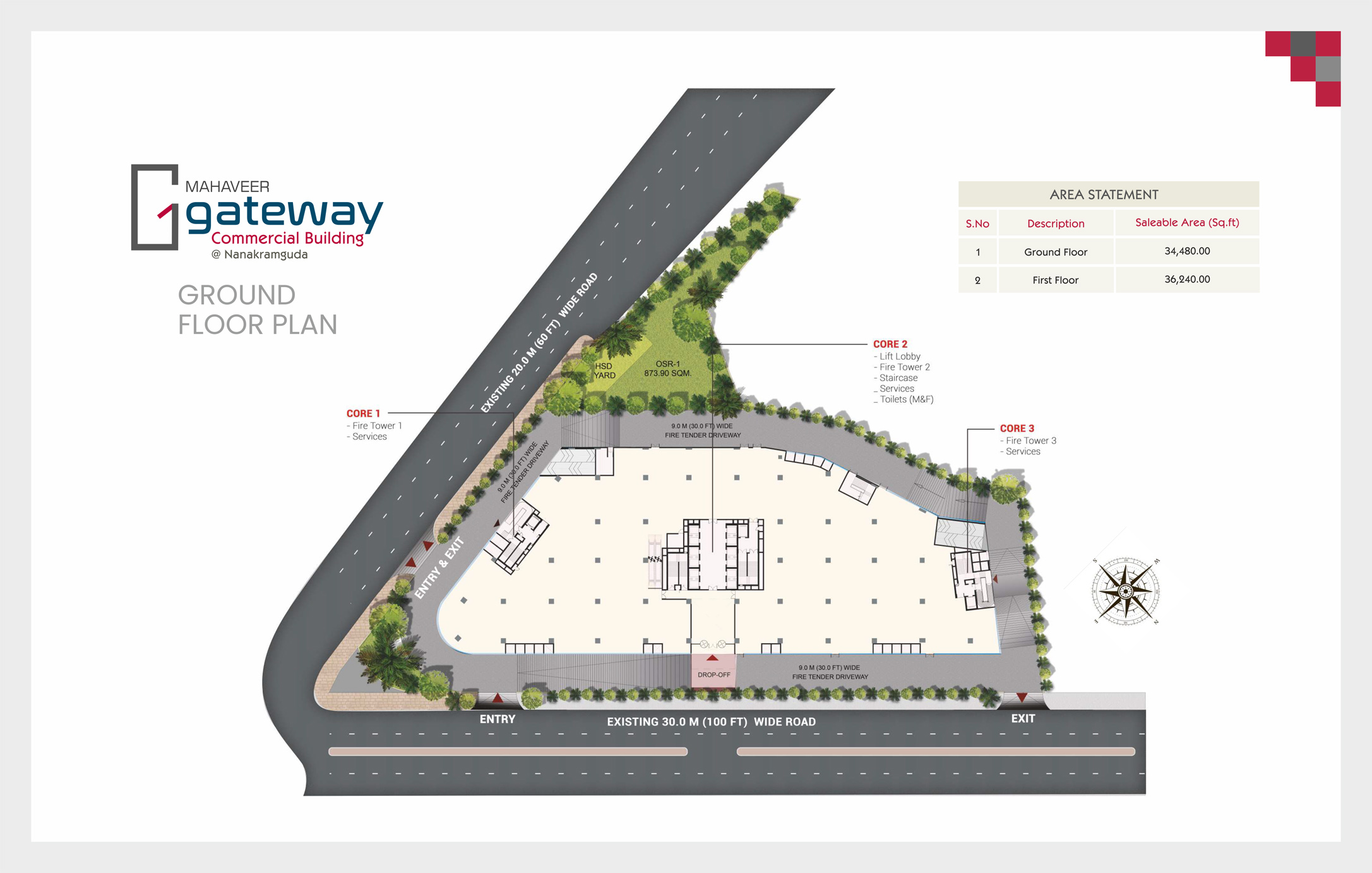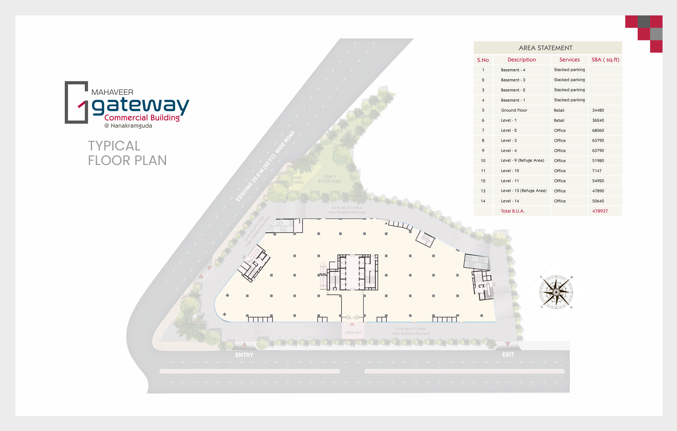 Mahavir Gateway has 4 basement (all basement stack parking) with a parking ratio of 1:1000 Mahaveer Gateway located in the Nanakramguda, Near Gachibowli, the premium superior grand office & retail spaces is very close to the Wipro and Infosys and the Financial District. The property is designed to serve your business needs well with all modern amenities backed by 24×7 security service. Excellent connectivity by public transport & with restaurants and hotels closer by, the area has a warm sense of community.